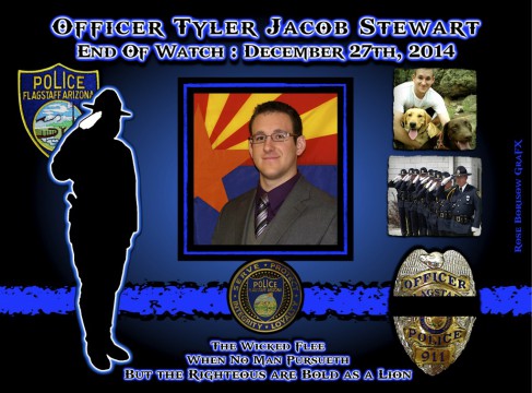 The 24-year-old Flagstaff Police Officer Tyler Stewart was shot from a range of approximately two feet by 28-year-old Robert William Smith while responding to a domestic violence case on December 28, 2014. When Stewart asked to pat the suspect down for any weapons, Smith reached for a gun he had in his pocket and began firing at Stewart at close range. Smith then walked away and fatally shot himself. Officer Tyler Stewart had been with the department for less than a year. He graduated from Boulder Creek High School in Anthem and Concordia College in California. He left behind his parents, three sisters and a girlfriend. Officer Tyler Stewart was buried on Friday, January 2, 2015 in Flagstaff.