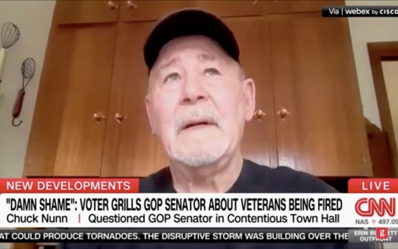 Chuck Nunn, a voter in ruby red Kansas, came Monday just two days after Marshall was booed out of a town hall when Nunn questioned him about federal cuts affecting veterans – which he called a “shame.”