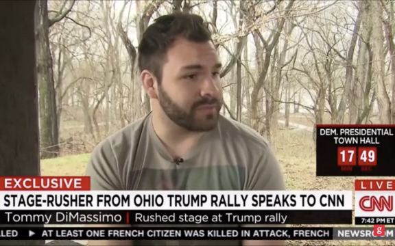 The newspaper said DiMassimo vaulted over waist-high metal railings, muscled past security guards and nearly got on the stage at the end of Trump’s rally before Secret Service agents tackled and handcuffed him. Video shows Trump, the front-runner in the Republican presidential campaign, turning around after hearing the commotion followed by agents surrounding him protectively. Trump was campaigning ahead of Tuesday’s Ohio primary
