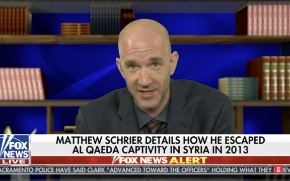 In July 2013 Schrier became the first Westerner to ever successfully escape from al Qaeda. Before sunrise, his cellmate Peter Theo Curtis lifted Schrier through the window, enabling Schrier to escape. Now outside of the prison, Schrier then decided his best chance of survival was to leave Curtis behind and escape alone. The men have given conflicting accounts of the escape attempt. Schrier claims that Curtis became stuck in a window and so he left him behind. Curtis claims this is a lie. He has said that Schrier failed to help him adequately and abandoned him, and he has said that he told Schrier to go for help.